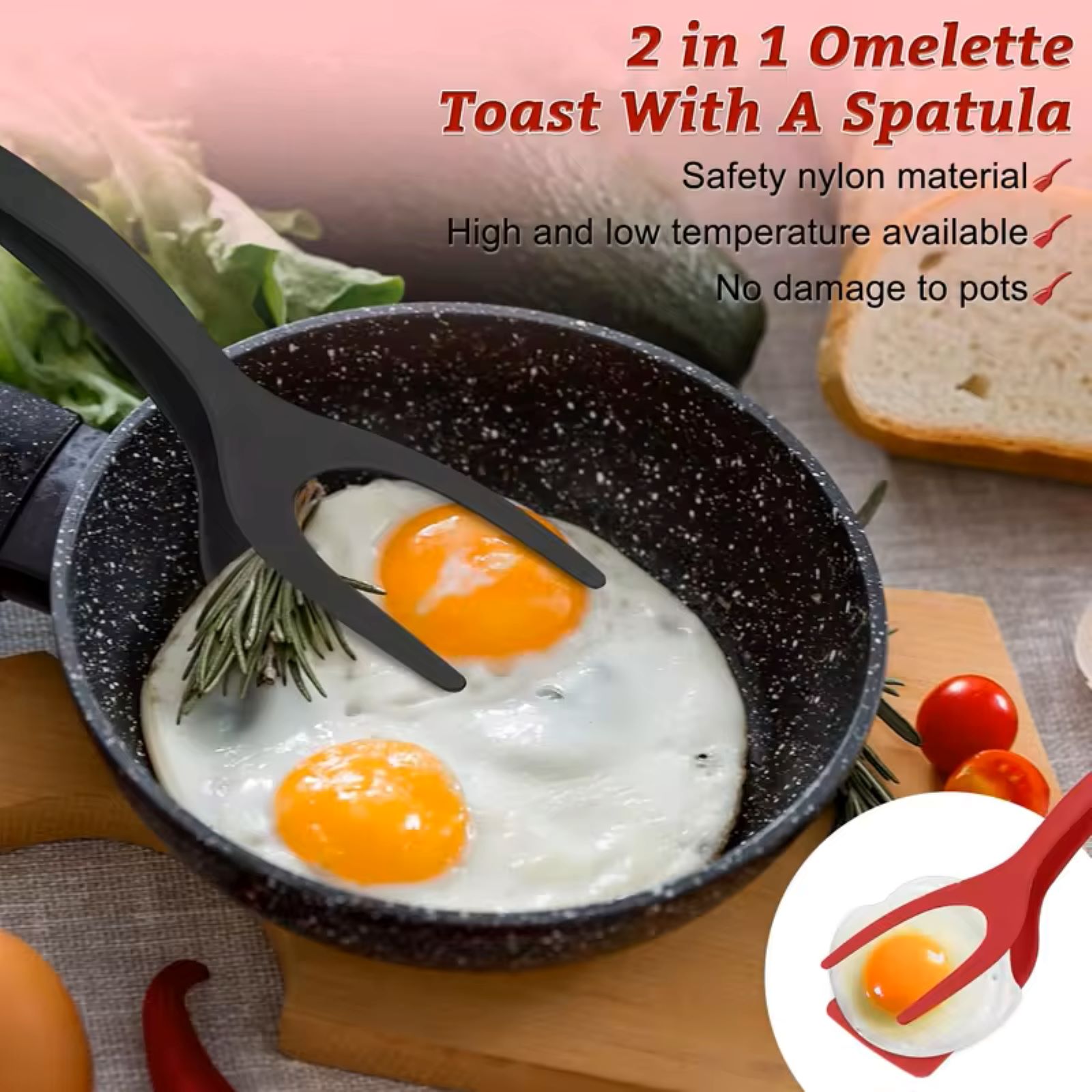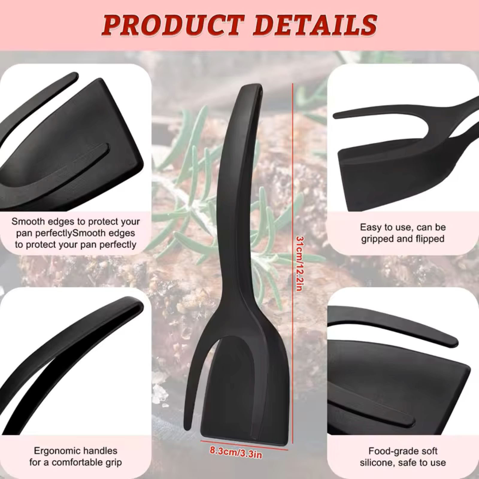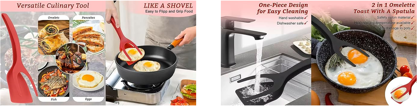 Smooth edges to protect your pan perfectly Smooth edges to protect your pan perfectly, Easy to use, can be gripped and flipped, Ergonomic handles for a comfortable grip, Food-grade soft silicone, safe to use