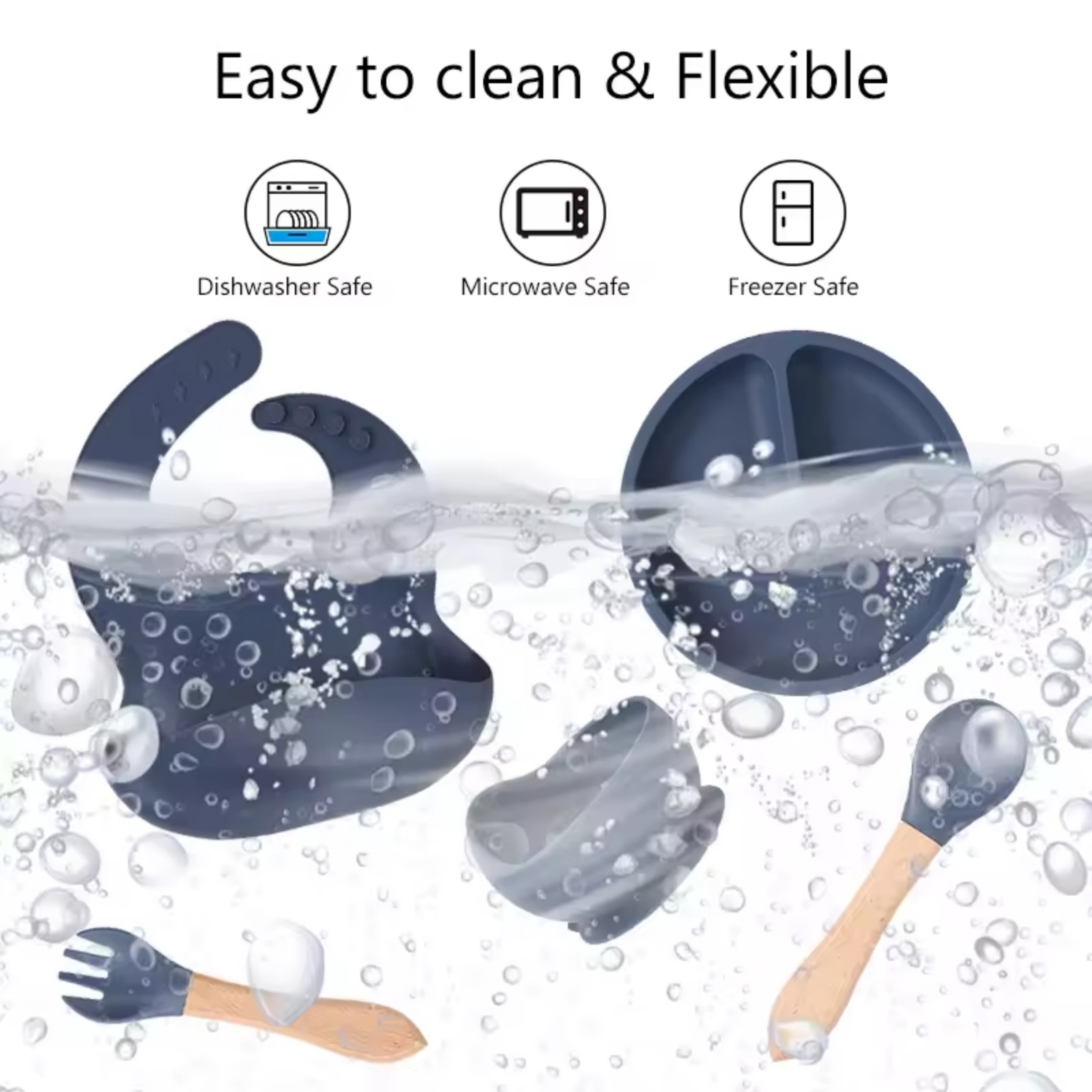Safety comes first. Our weaning set is made from 100% food-grade silicone, BPA-free, non-toxic, and FDA-approved. It’s flexible, durable, and built to withstand daily use while remaining gentle for babies.